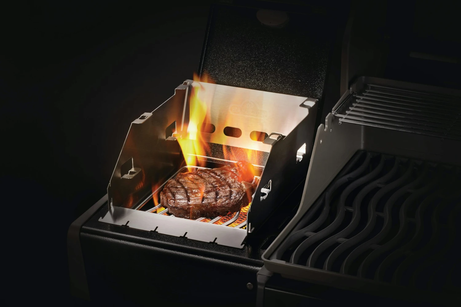 Multifunktionaler Windschutz. Auch bei stärkerem Wind brennt die Sizzle Zone stabil. Der Grillrost kann in drei weitere Positionen verstellt werden. Die blende vorne kann geklappt werden so dass der Zugang mit der Grillzange erleichtert wird. Zudem ist eine Spießhalterung integriert die es ermöglicht über der Sizzle Zone Grillspieße ohne direkten kontakt zum Rost zu grillen. Rost nicht im Lieferumfang enthalten!