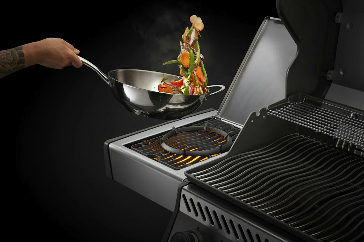 Napoleon Wok-Ring aus Gusseisen mit stabilem Halt auf der SIZZLE ZONE. Verankert sich stabil im Grillrost.