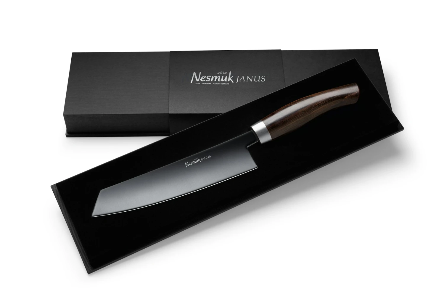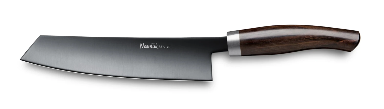 HANDWERKSKUNST TRIFFT HIGH-TECH Nesmuk JANUS – unverkennbar an der schwarzen Klinge – wird aus einem Hochleistungsstahl mit Niobanteil gefertigt und mit einer hochwertigen Diamond-Like-Carbon Beschichtung (DLC) veredelt, die die funktionalen Eigenschaften der Klinge optimiert. Das Kochmesser mit einer 180 mm langen und 4 mm starken, einseitig hohlgeschliffenen Klinge ist der Allrounder, mit dem man rund 80 % aller Schneidaufgaben erledigen kann. Als „Basis-Messer“ in jeder Küche unverzichtbar und vielseitig einsetzbar.