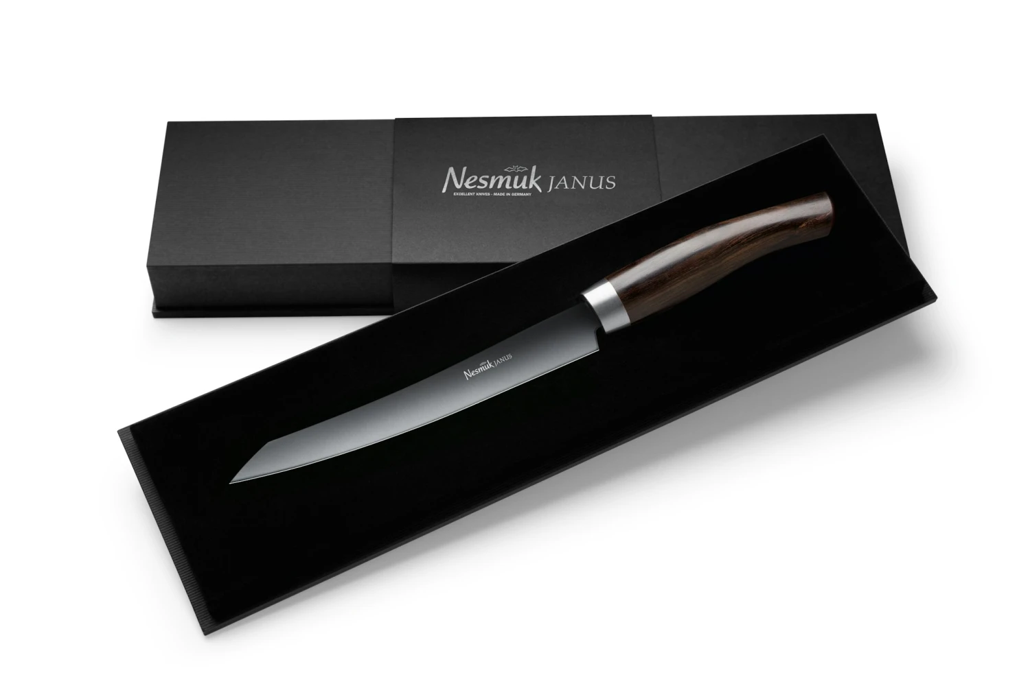 TRADITION UND FORTSCHRITT Nesmuk JANUS – unverkennbar an der schwarzen Klinge – wird aus einem Hochleistungsstahl mit Niobanteil gefertigt und mit einer hochwertigen Diamond-Like-Carbon Beschichtung (DLC) veredelt, die die funktionalen Eigenschaften der Klinge optimiert. Die schmale, 160 mm lange Klinge des Slicers ist ideal zum Filetieren. Für alle Feinarbeiten, wie das Parieren von Fleisch, Filetieren von Fisch und Fleisch oder Filieren von Gemüse und Obst. Aber auch hervorragend geeignet, Speck, Schinken etc. hauchfein zu schneiden.