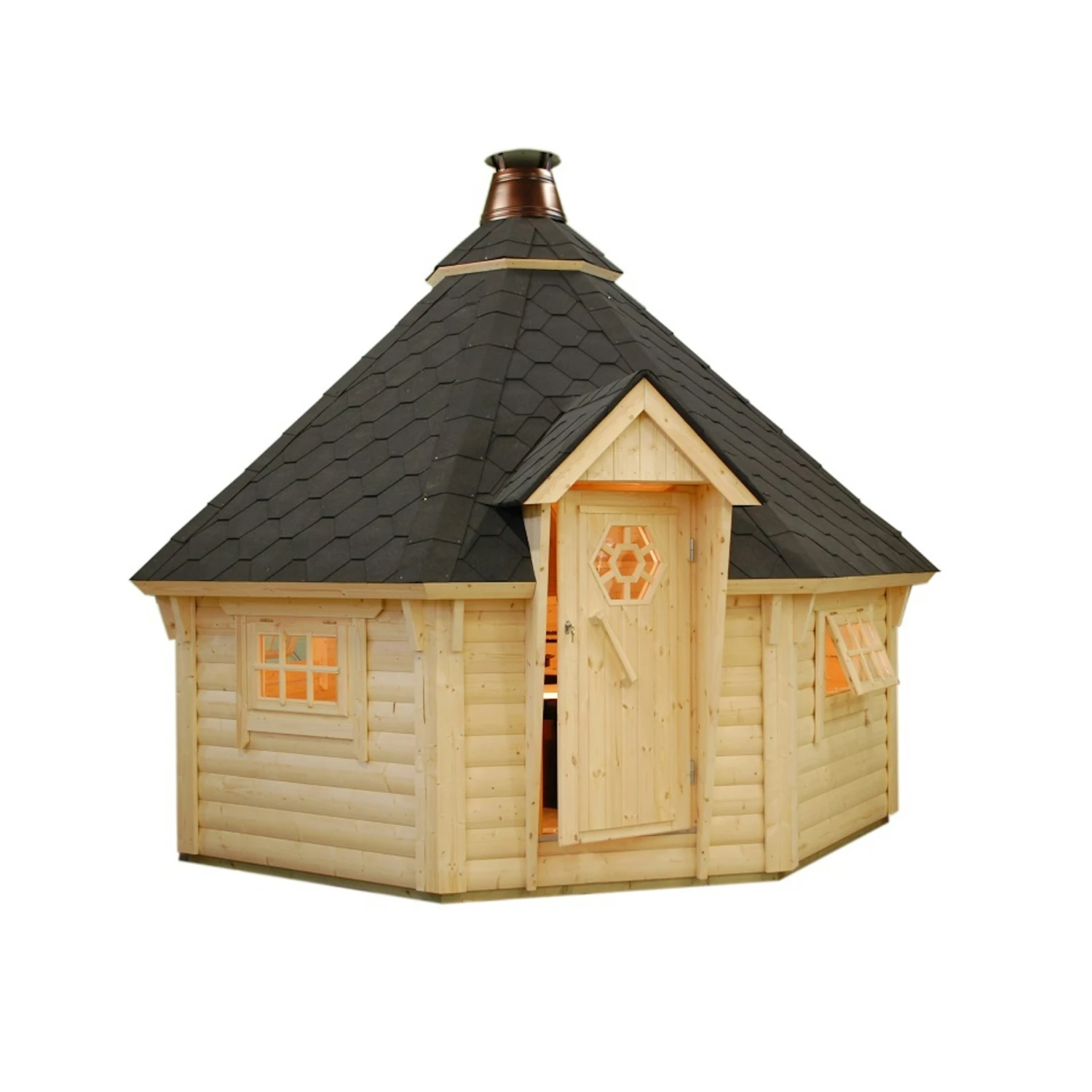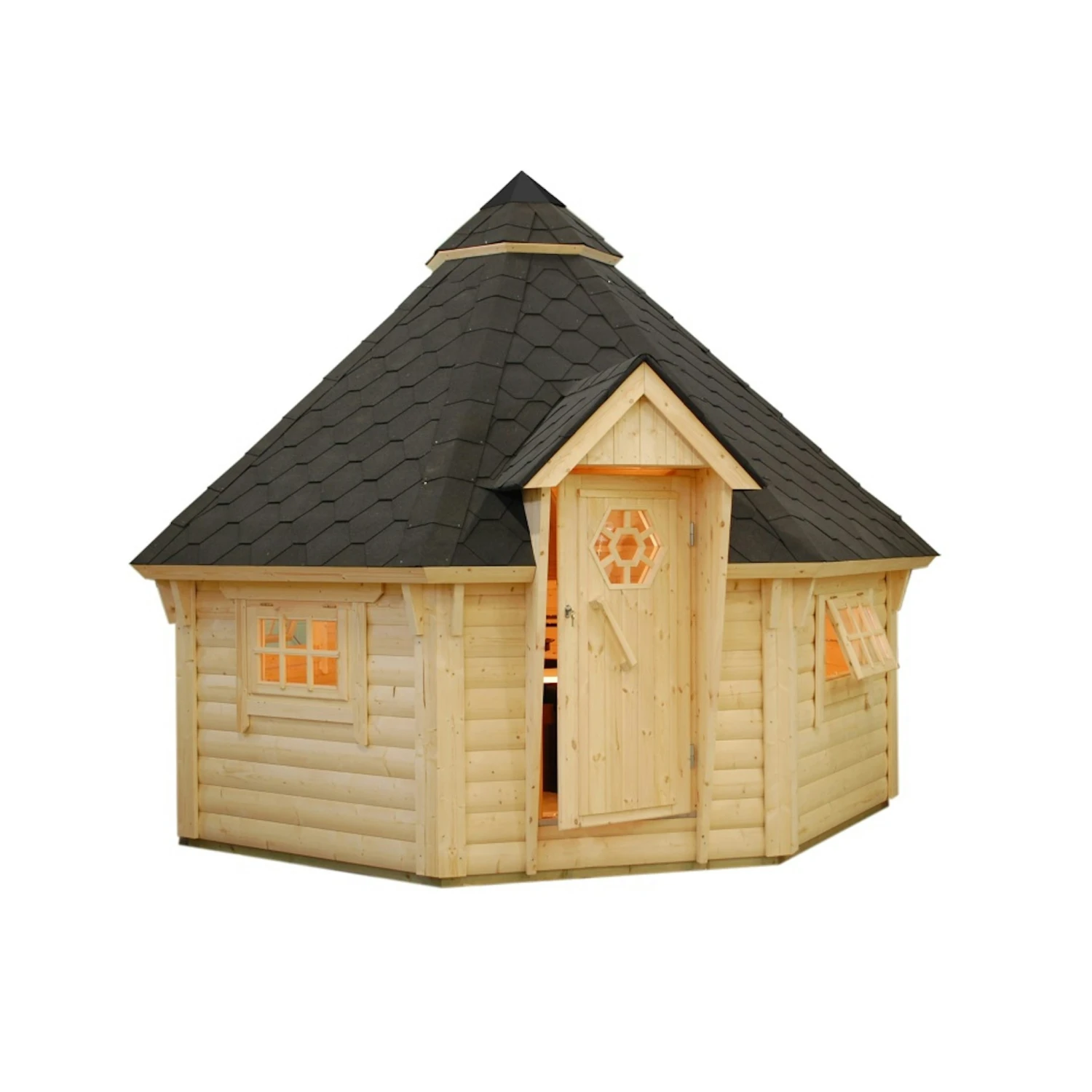 Verlängern Sie mit der 8-Eck Palmako Grillkota Eva 11,4 m² – 44 mm die Grillsaison. Die Grillhütte ist aus unbehandeltem Fichtenholz hergestellt und daher robust, wetterbeständig und langlebig. Mit einem einfachen Steck- und Schraubsystem kann diese unkompliziert zusammengebaut werden. Den passenden Grillofen mit Rauchabzug und Tisch finden Sie im Reiter „Zubehör“. Durchmesser: Ø 379 cm // Firsthöhe: 346 cm Ausführung: naturbelassen, Tauchimprägnierung in hellbraun, grau oder transparent